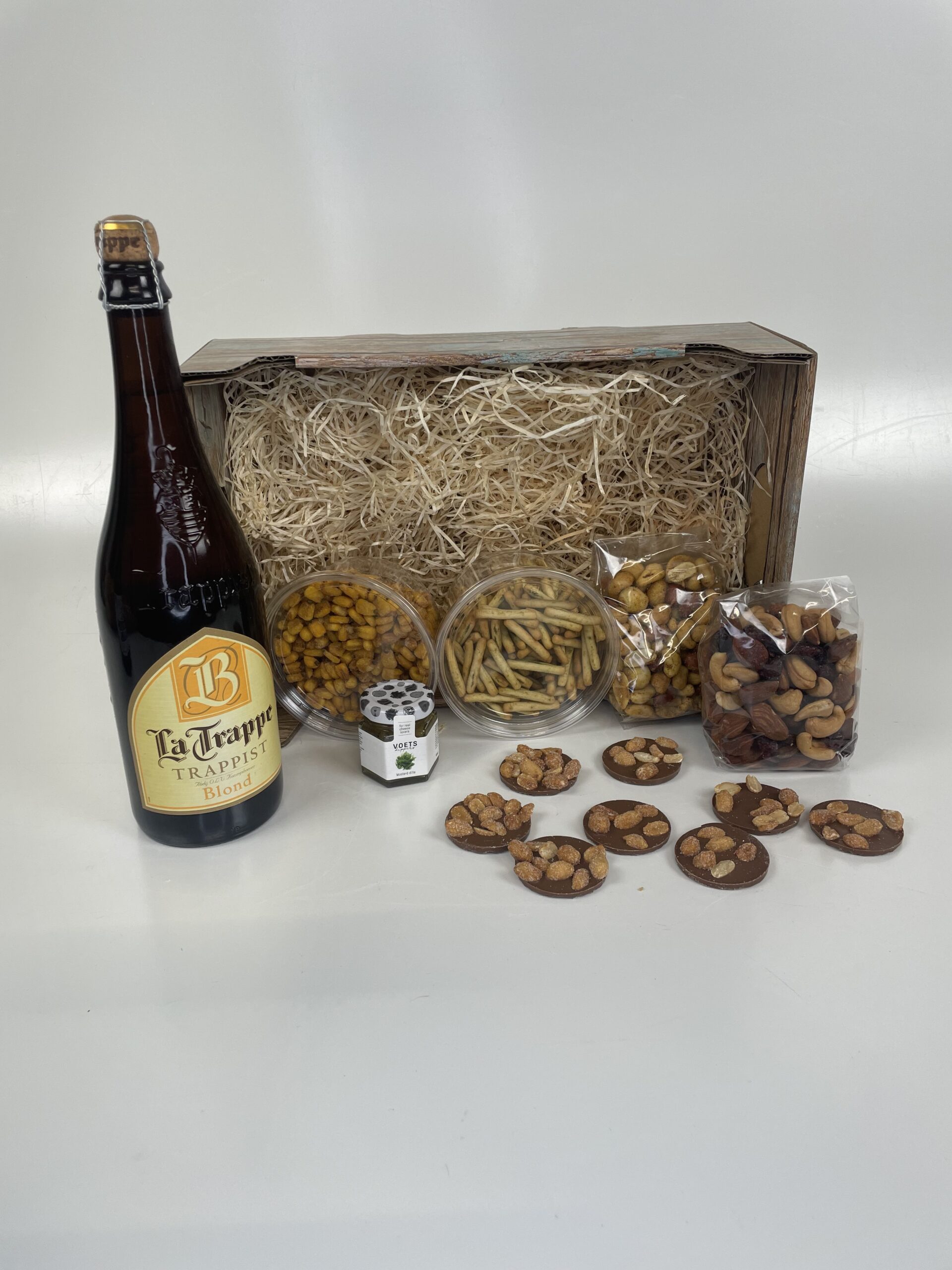 Wadden melange, VOC melange, choco flikjes met honey salted nuts, sour cream crackers, grissini basilicum stokjes, mosterd-dille dip en speciaal bier. Dit geheel wordt voor u mooi verpakt in een oogstkrat van 30 cm bij 20 cm en 12 cm hoog